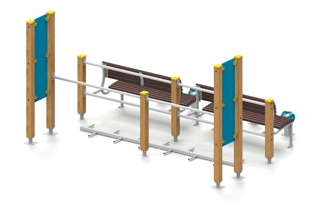 Bois lamellé-collé traité en autoclave classe IV, bois tropical, acier peint à la poudre, polyéthylène, HPL et plastique recyclé.