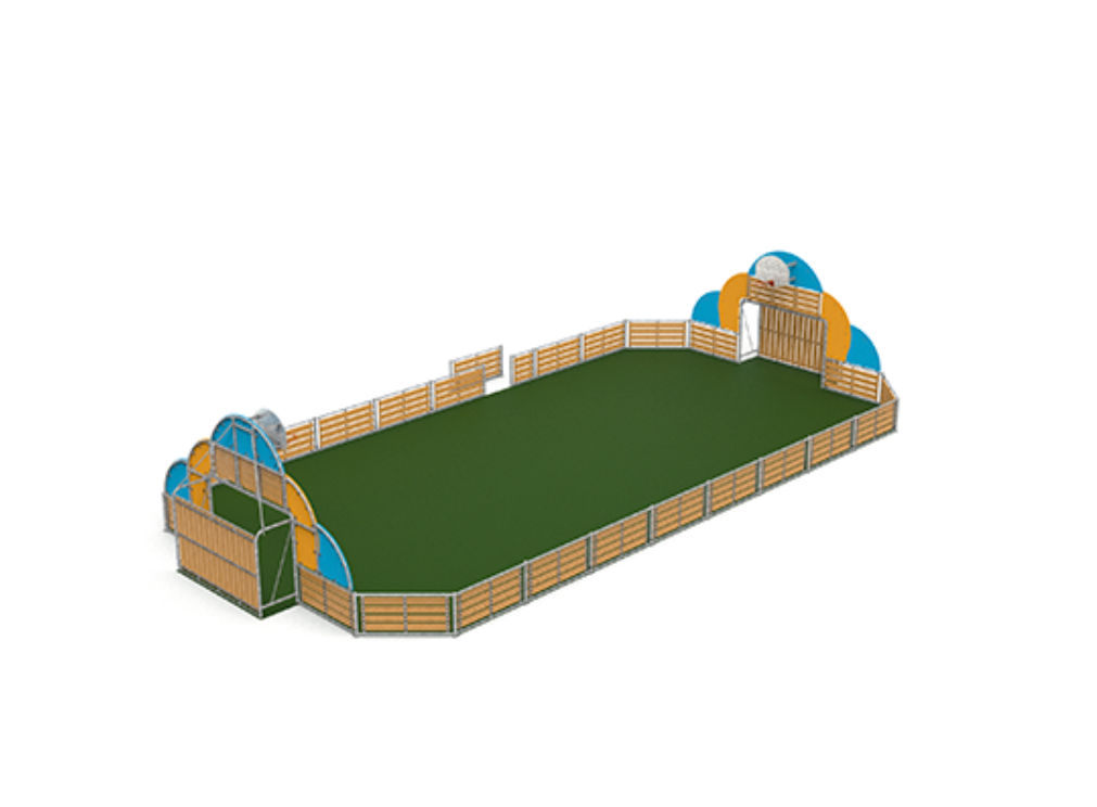 Le terrain multisport, certifié selon la norme EN 15312 pour le matériel sportif à accès libre, est un espace polyvalent (buts et entrée inclus), entièrement entouré de clôtures en métal galvanisé et de bois, où il n’y a aucun risque d’enfermement.