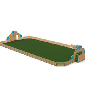 La clôture périphérique est composée de tubes galvanisés de 2 1/2″ E=3,2 mm pour les poteaux, et de 1 1/2 E=2,9 mm pour le reste des tubes. Il est fabriqué en lattes de bois technologiques de 145 x 45 mm ; tous assemblés avec des DIN603 M10x70 galvanisés et DIN603 M10x30, un bouchon anti-vandalisme, une rondelle et un écrou auto-verrouillant. La hauteur de la clôture est de 950 mm.