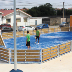 Le nettoyage du sol et l’évacuation de l’eau sont facilités par l’espace à la base de la clôture entourant la piste, ce qui permet l’évacuation de l’eau et des déchets.