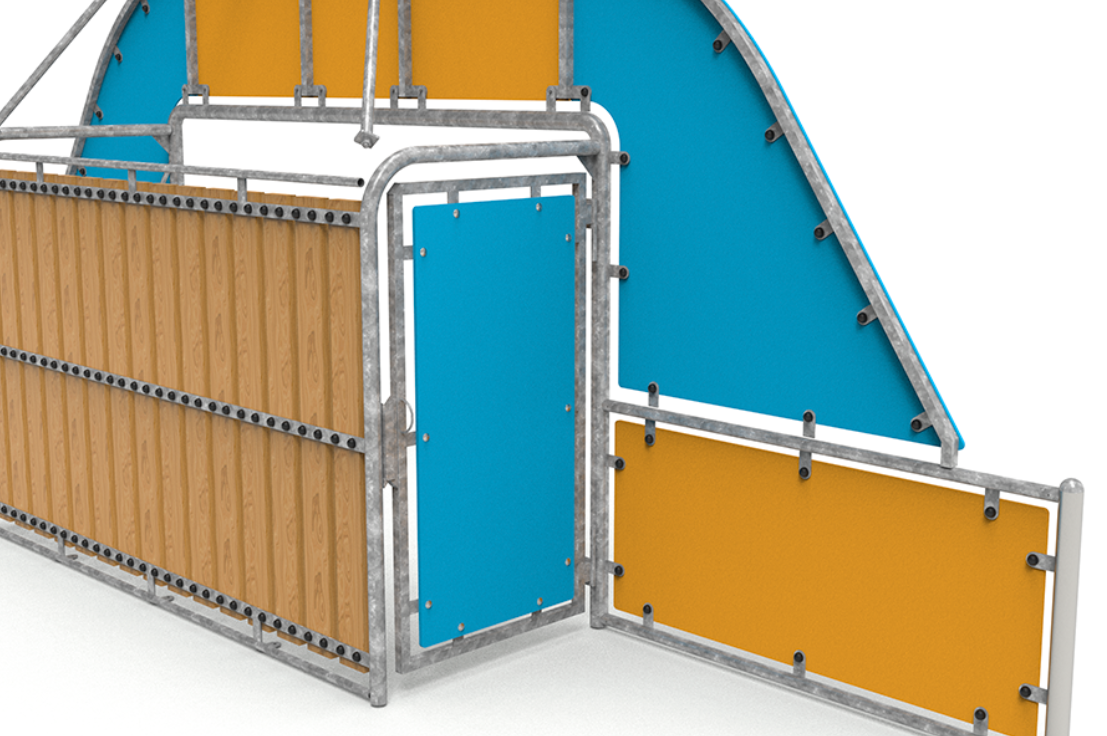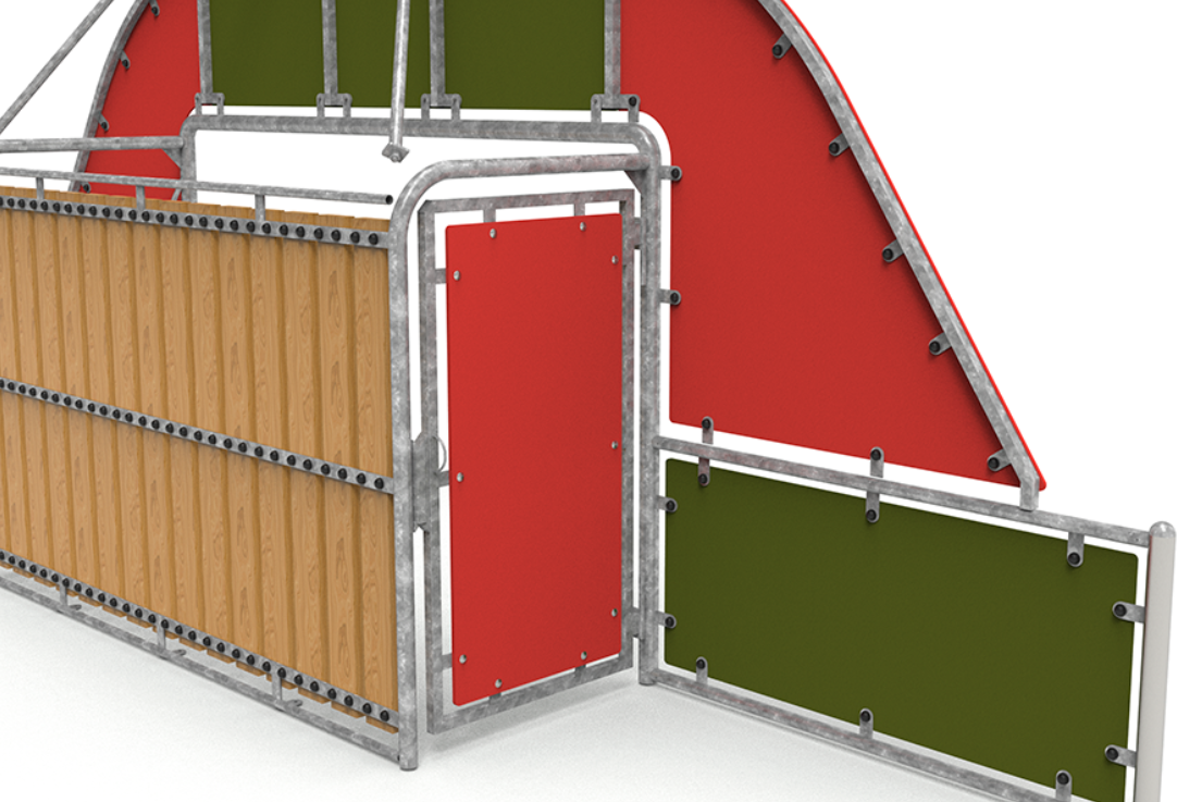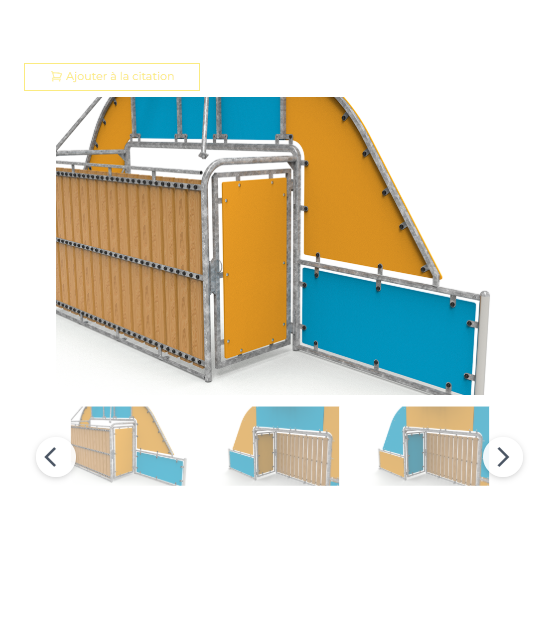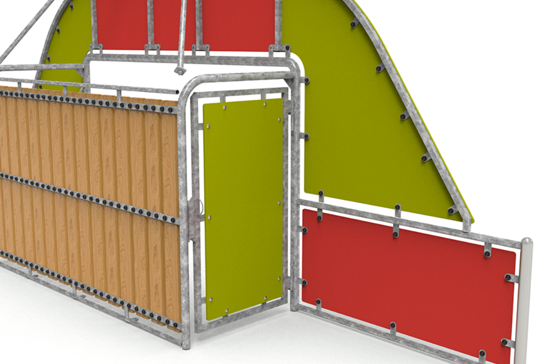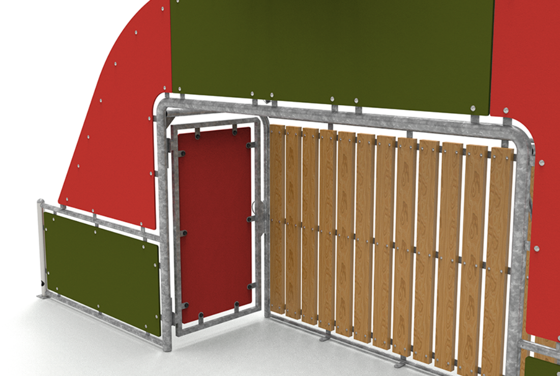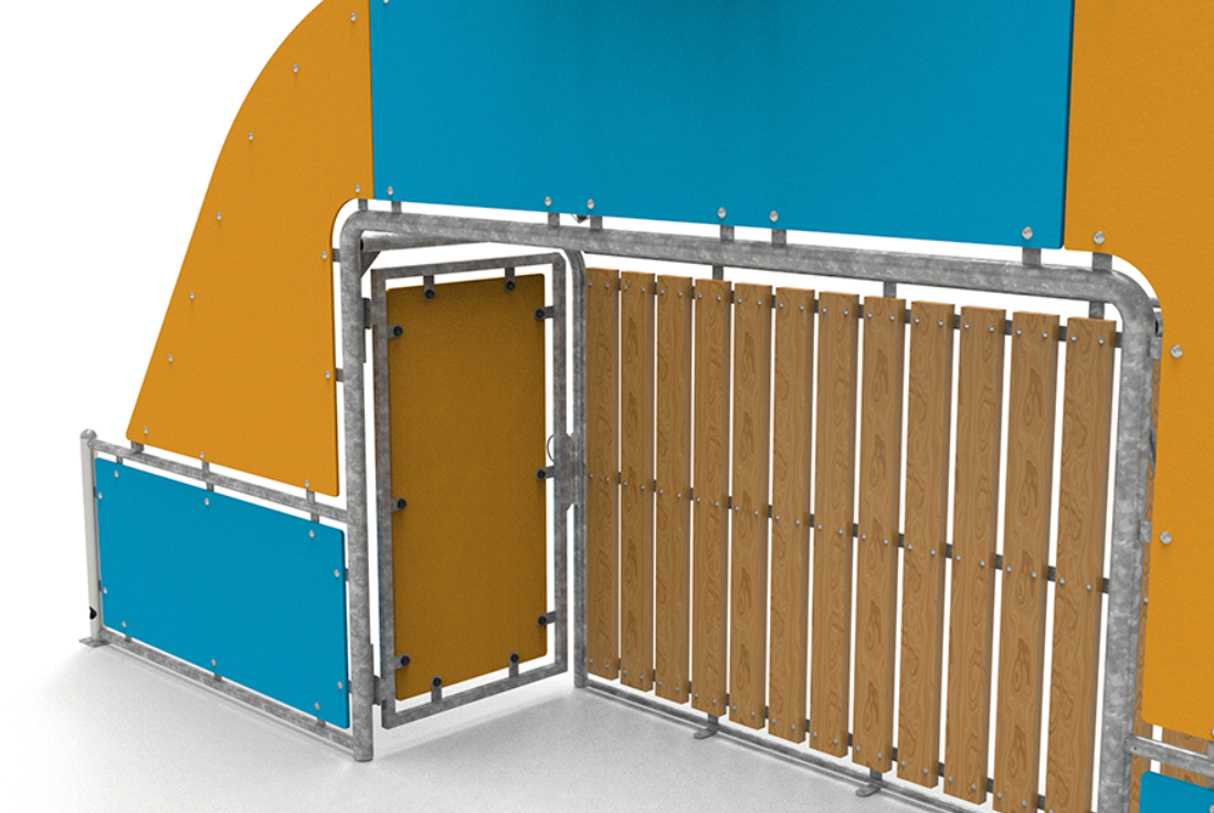 Le module est composé de 2 1/2″ E=3,2 mm galvanisés pour les poteaux, et de 1 1/2 E=2,9 mm pour le reste des tubes. Il est fabriqué en lattes de pin autoclavé de classe IV de 1860 x 45 mm ; tous assemblés avec des DIN603 M10x70 galvanisés et DIN603 M10x30, un bouchon anti-vandalisme, une rondelle et un écrou auto-verrouillant.