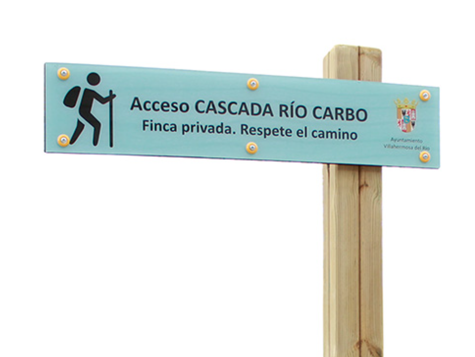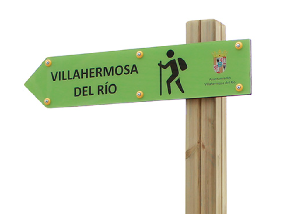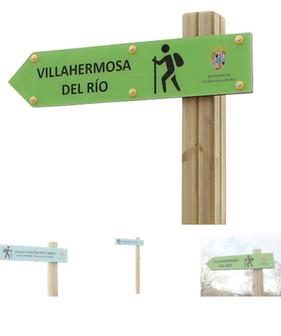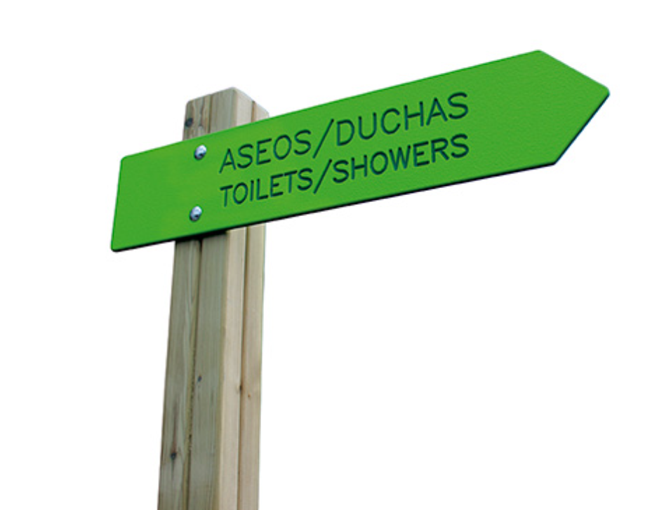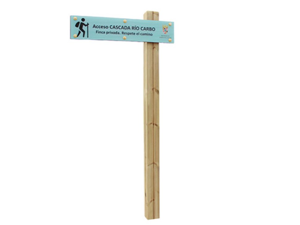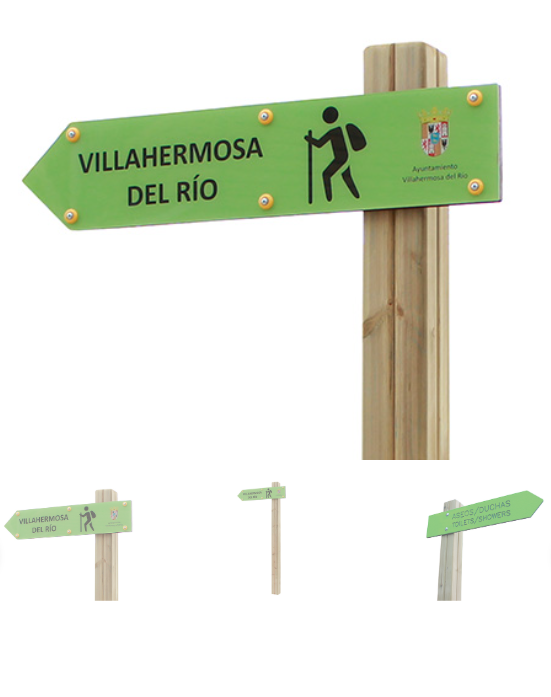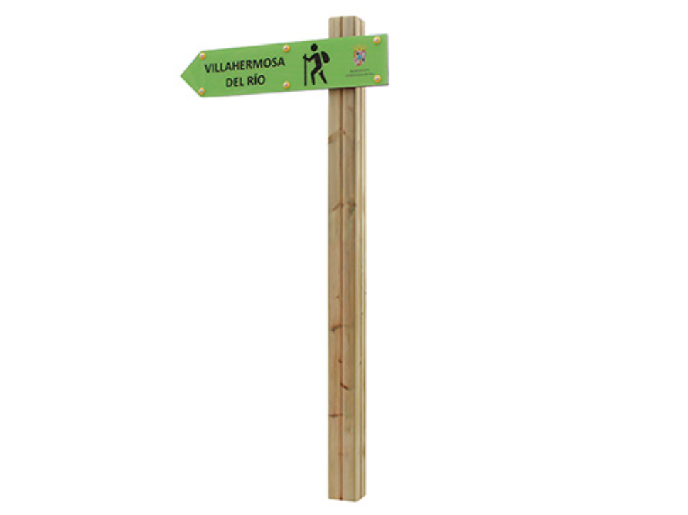MI016 Panneau de fléchage 0,7x 0,1xH1,5 m., bois et panneau polyéthylène gravé 70×15 cm. 91 € HT