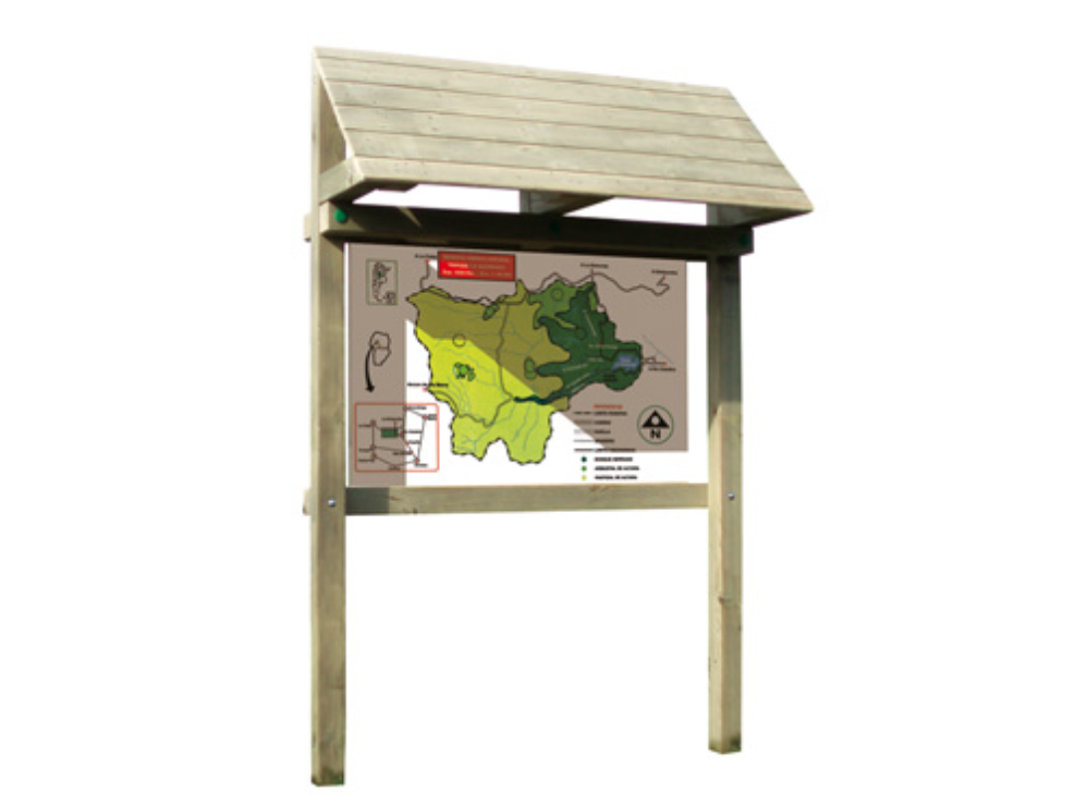 MI007, Panneau d’information bois, sur pieds, avec toiture, H2,5 m., panneau en méthacrylate 122×80 cm. 962 € HT