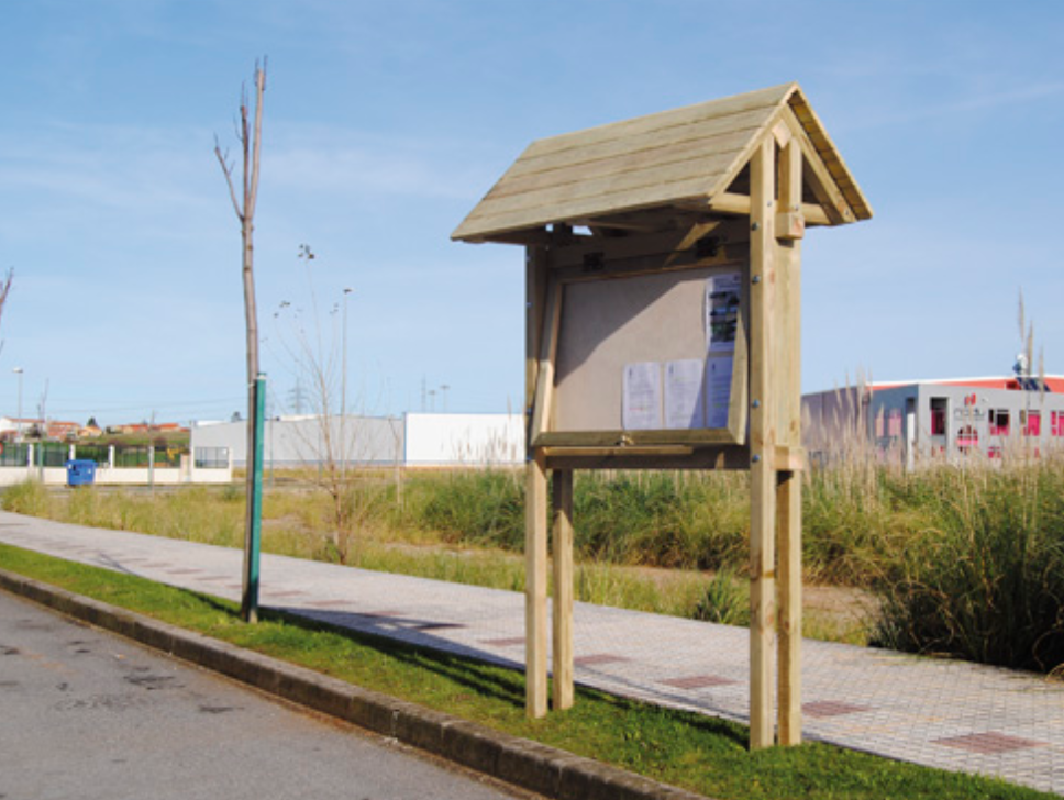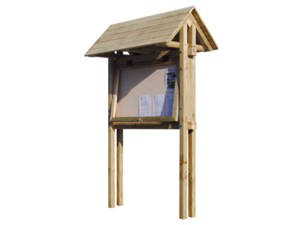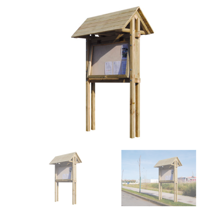 MI017 Panneau d’affichage bois, sur double pieds, avec double toiture, H2,5 m., protégé par une fenêtre rabattable en méthacrylate avec clé, 120×80 cm. 1.513 € HT