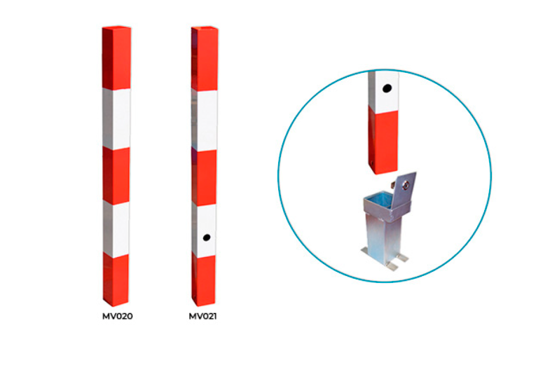 MV021 : 8 x 8 x 80 cm, AMOVIBLE, avec clé et boîte. 9,5 kg. Borne urbaine, en acier, finition peinture antirouille, en rouge et blanc,