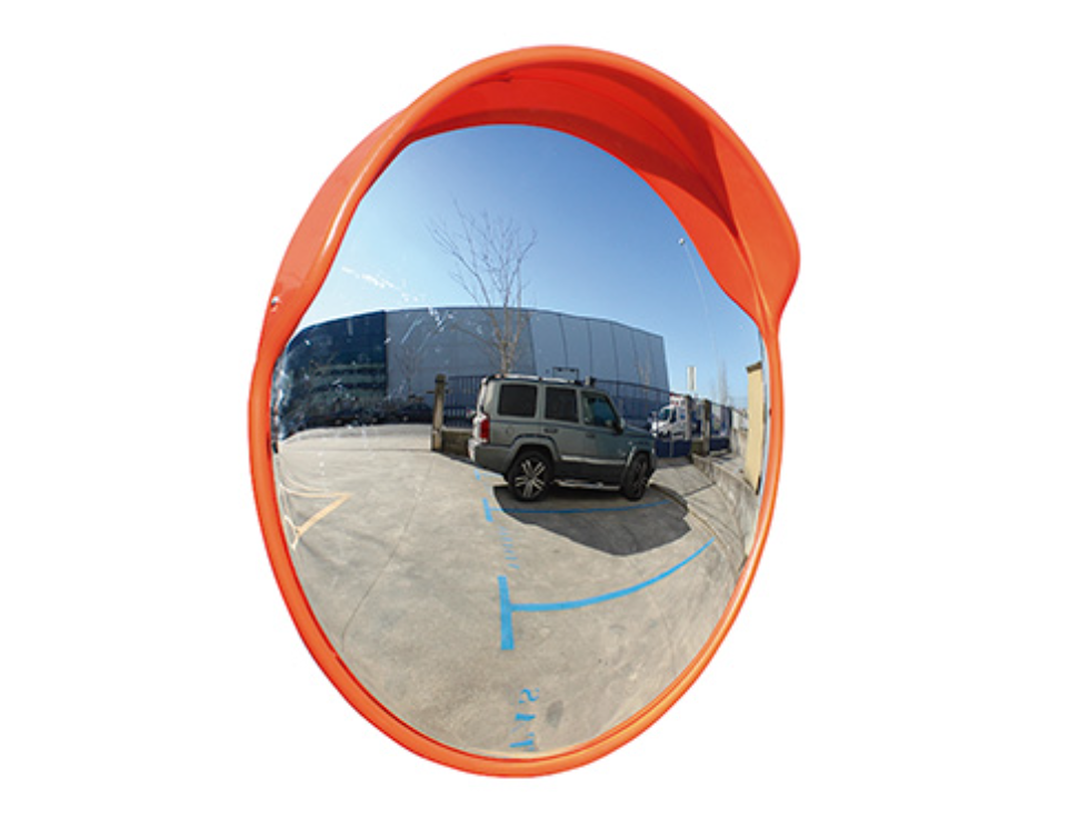 MV071 : Miroir convexe circulaire à usage extérieur qui permet de contrôler deux sens (angle de 90º) de circulation de véhicules aux points offrant peu de visibilité. J’ai intégré un parasol. Haute résistance.