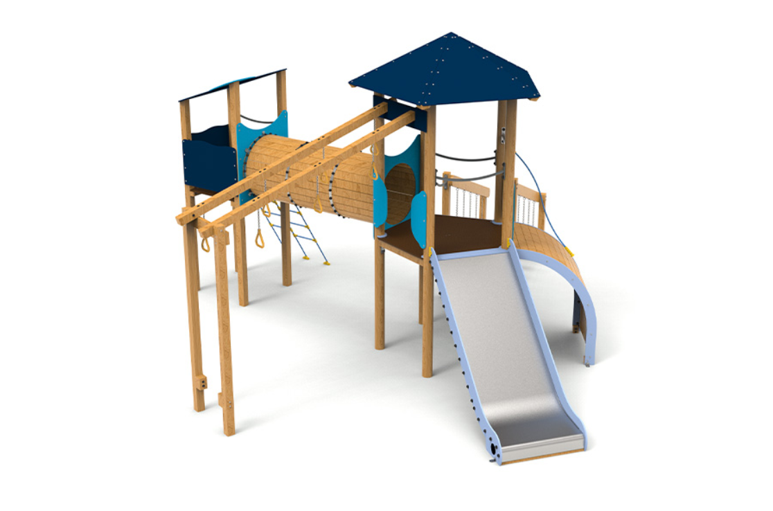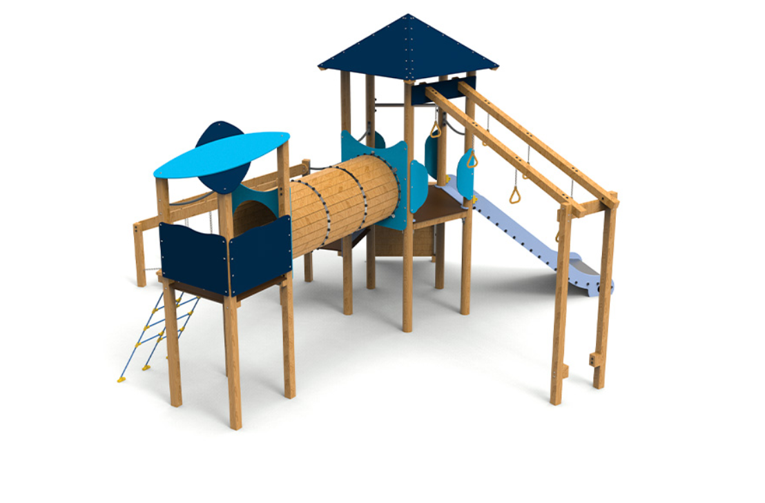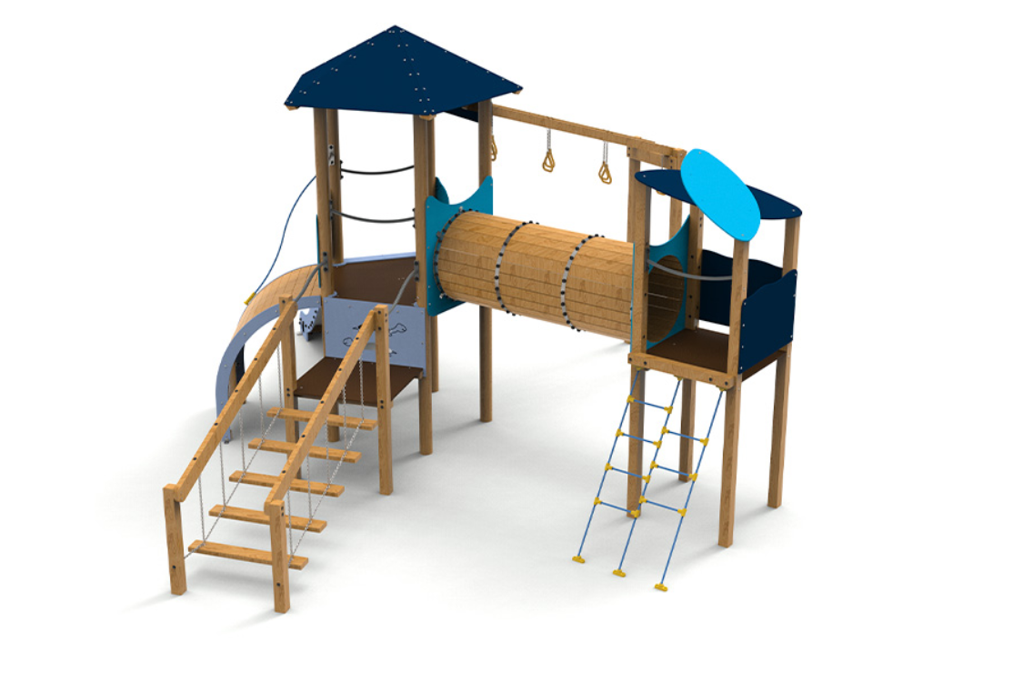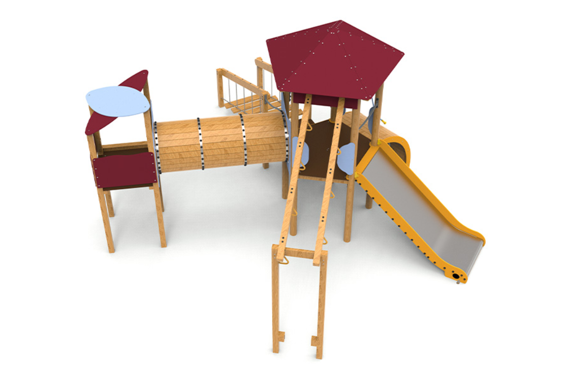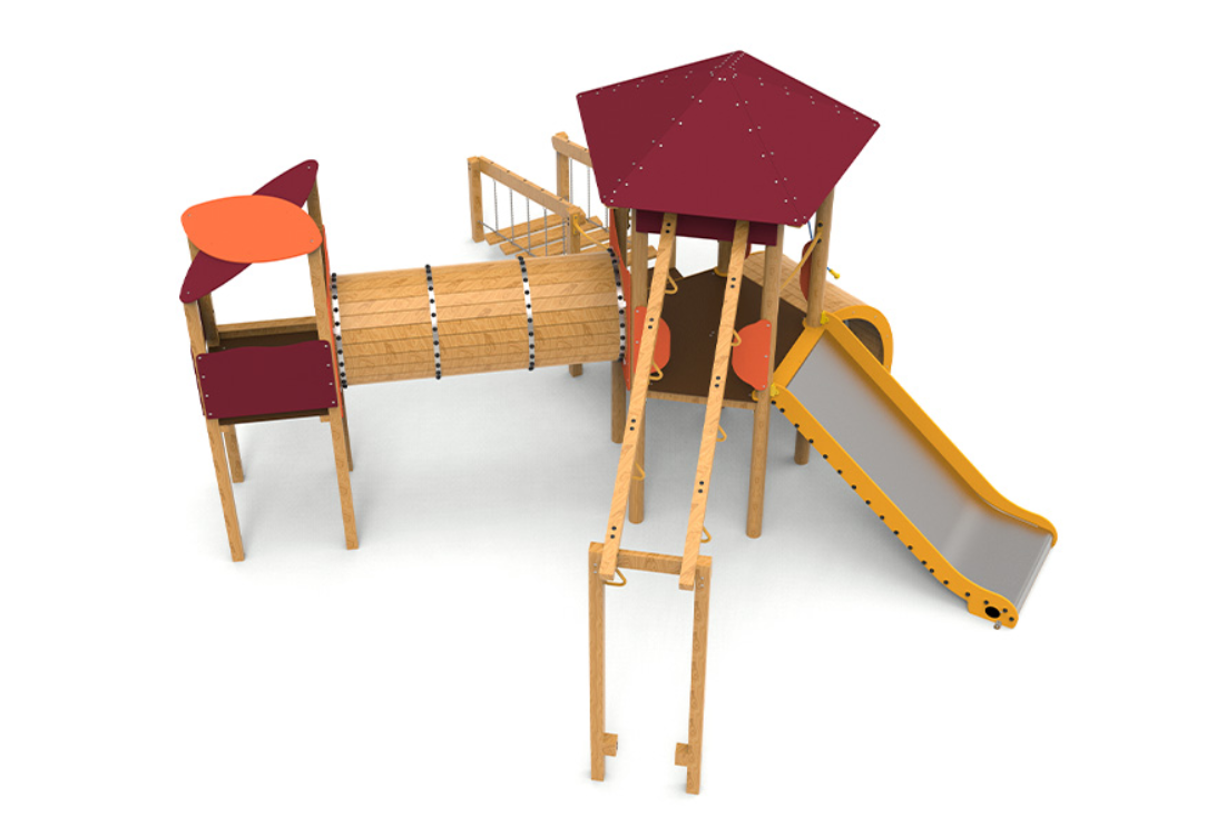 Le complexe est composé d’une tour pentagonale avec un toit qui sert d’axe central au jeu. Elle comprend des anneaux d’escalade, une échelle oscillante qui met à l’épreuve l’équilibre, un tunnel relié à une tourelle pour encourager l’exploration, une rampe courbe et un large coulissement d’une hauteur de 1,50 mètre, idéal pour des descentes palpitantes.
