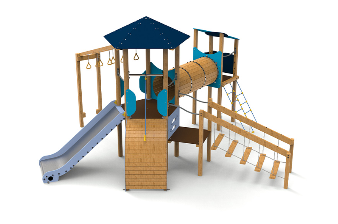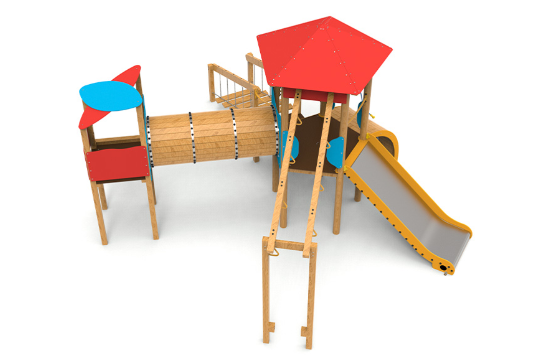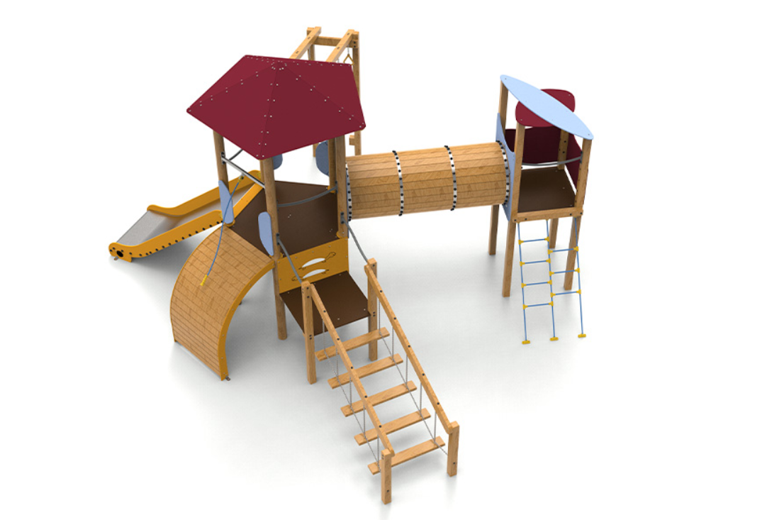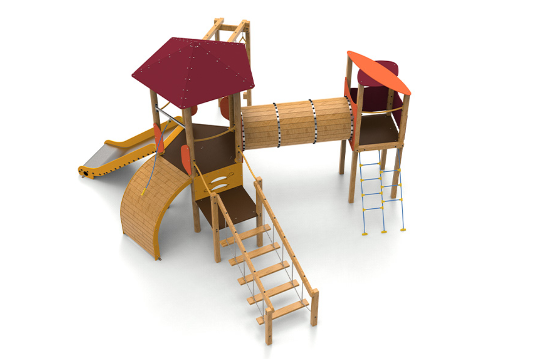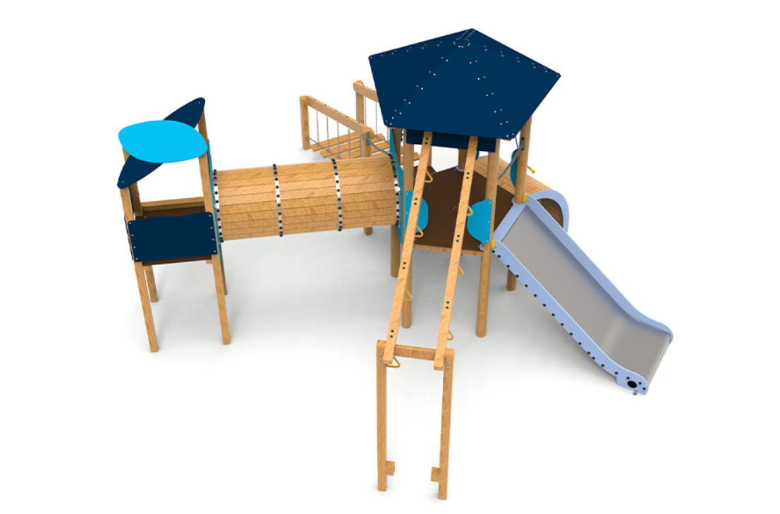 Le complexe est composé d’une tour pentagonale avec un toit qui sert d’axe central au jeu. Elle comprend des anneaux d’escalade, une échelle oscillante qui met à l’épreuve l’équilibre, un tunnel relié à une tourelle pour encourager l’exploration, une rampe courbe et un large coulissement d’une hauteur de 1,50 mètre, idéal pour des descentes palpitantes.