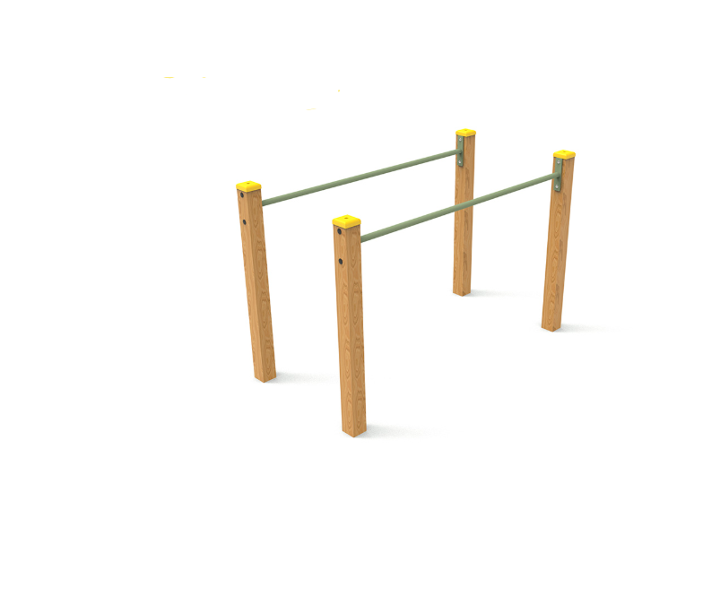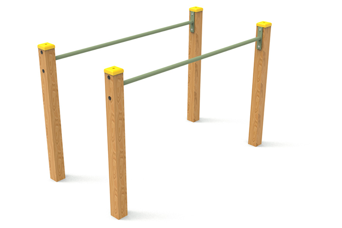 Bois lamellé-collé traité en autoclave classe IV et acier peint à la poudre.