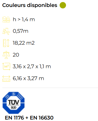 Selon les EN 1176 et EN 16630 : Il ne nécessite pas de sol absorbant les impacts selon le test HIC de la EN 1176.