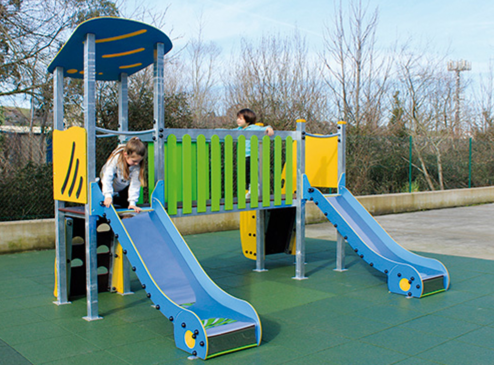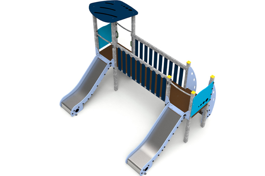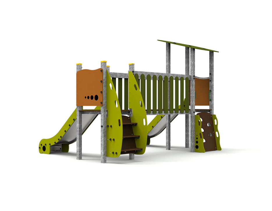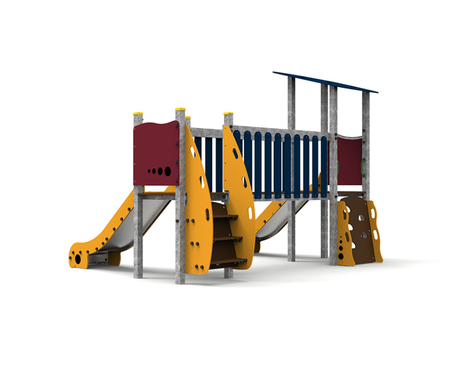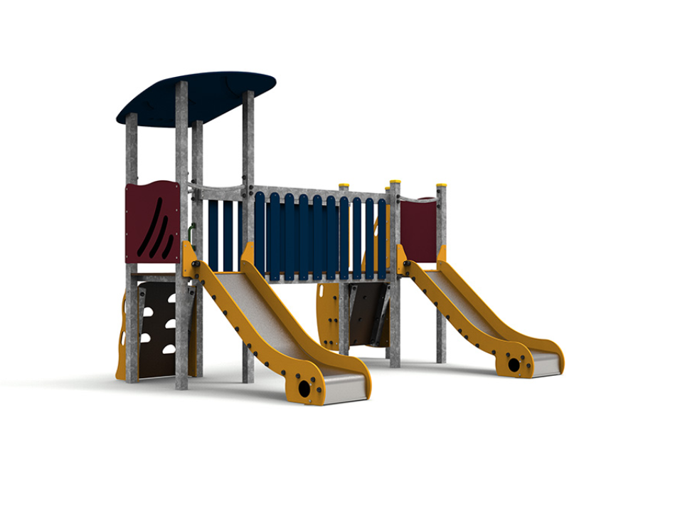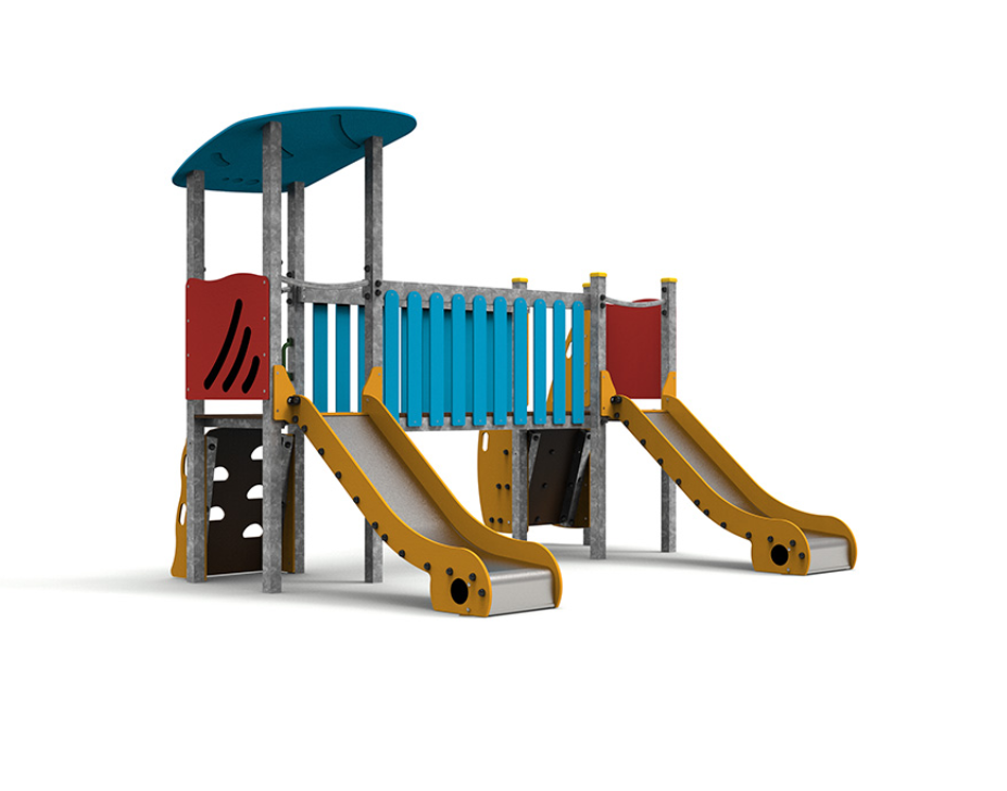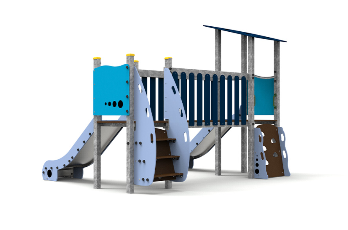 Le complexe est composé de deux tours accessibles par escalier, reliées par un pont, et comprend deux toboggans pour élargir les possibilités de jeu et de plaisir.