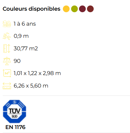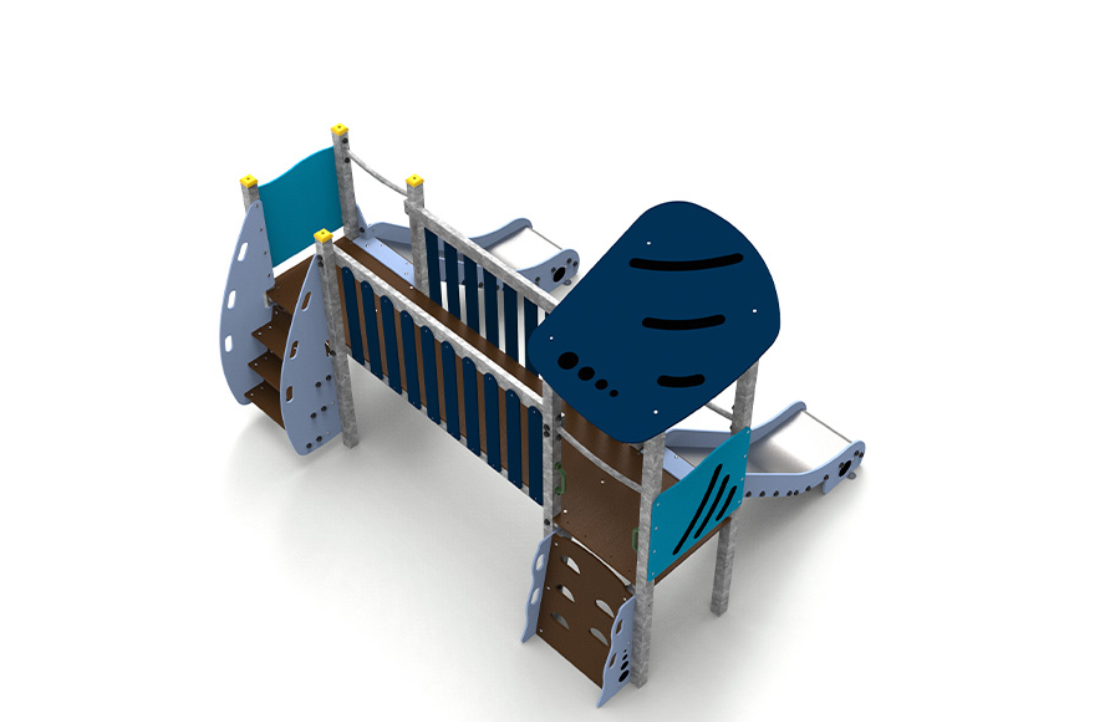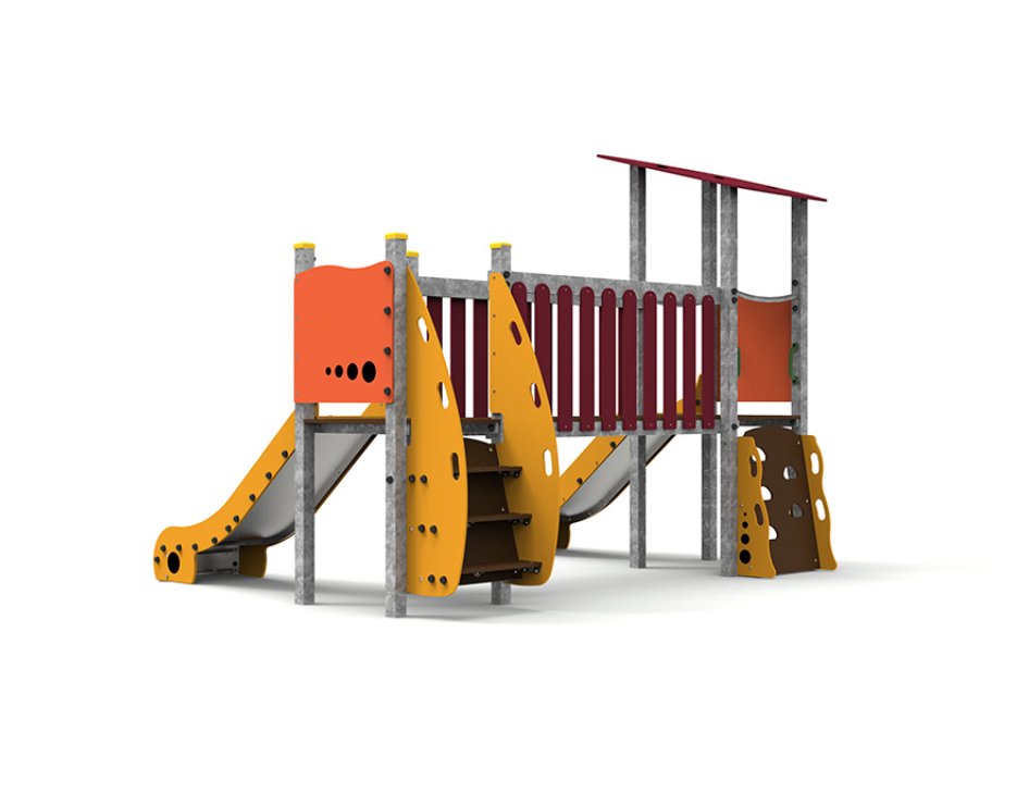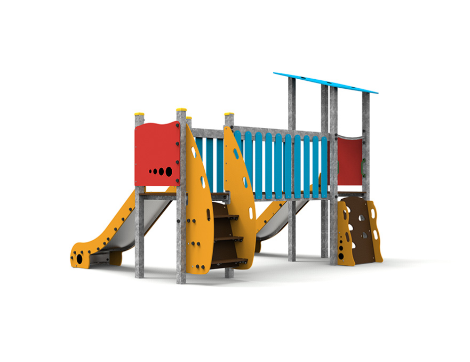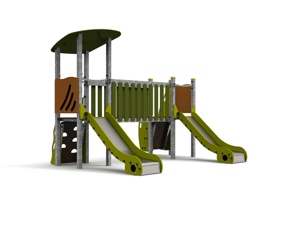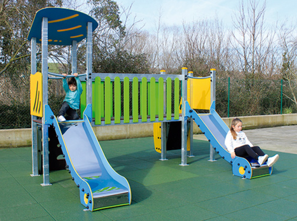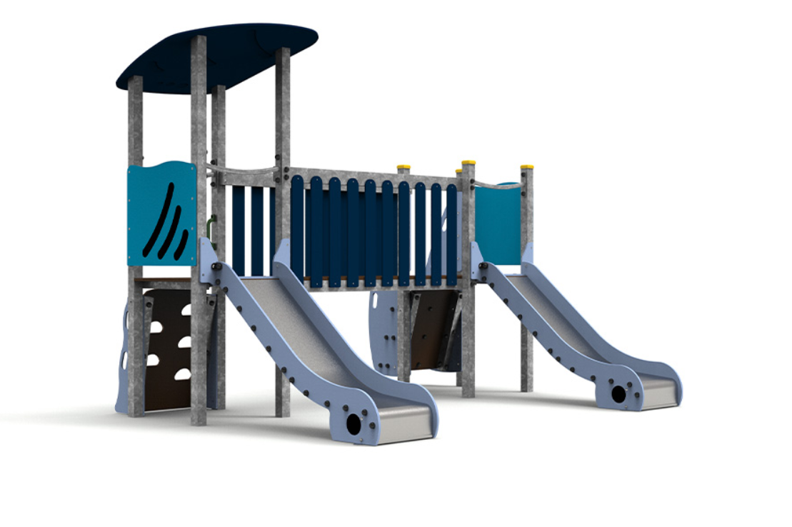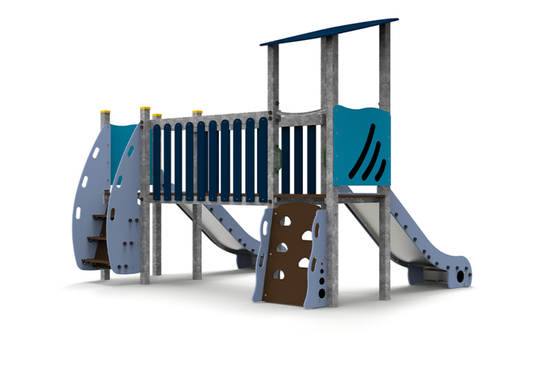 Le complexe est composé de deux tours accessibles par escalier, reliées par un pont, et comprend deux toboggans pour élargir les possibilités de jeu et de plaisir.